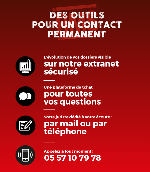 Notre site internet, mis à jour régulièrement, vous permet de suivre quasi en temps réel l’évolution de vos dossiers mais également d’interagir et de communiquer directement avec le juriste responsable des procédures de vos dossiers. Par ailleurs nous restons continuellement à la disposition de chacun par téléphone pour répondre à toutes vos questions et demandes de conseil. Sur des cas plus complexes le Directeur des Opérations Judiciaires peut également vous conseiller et venir à votre rencontre en cas de besoin.